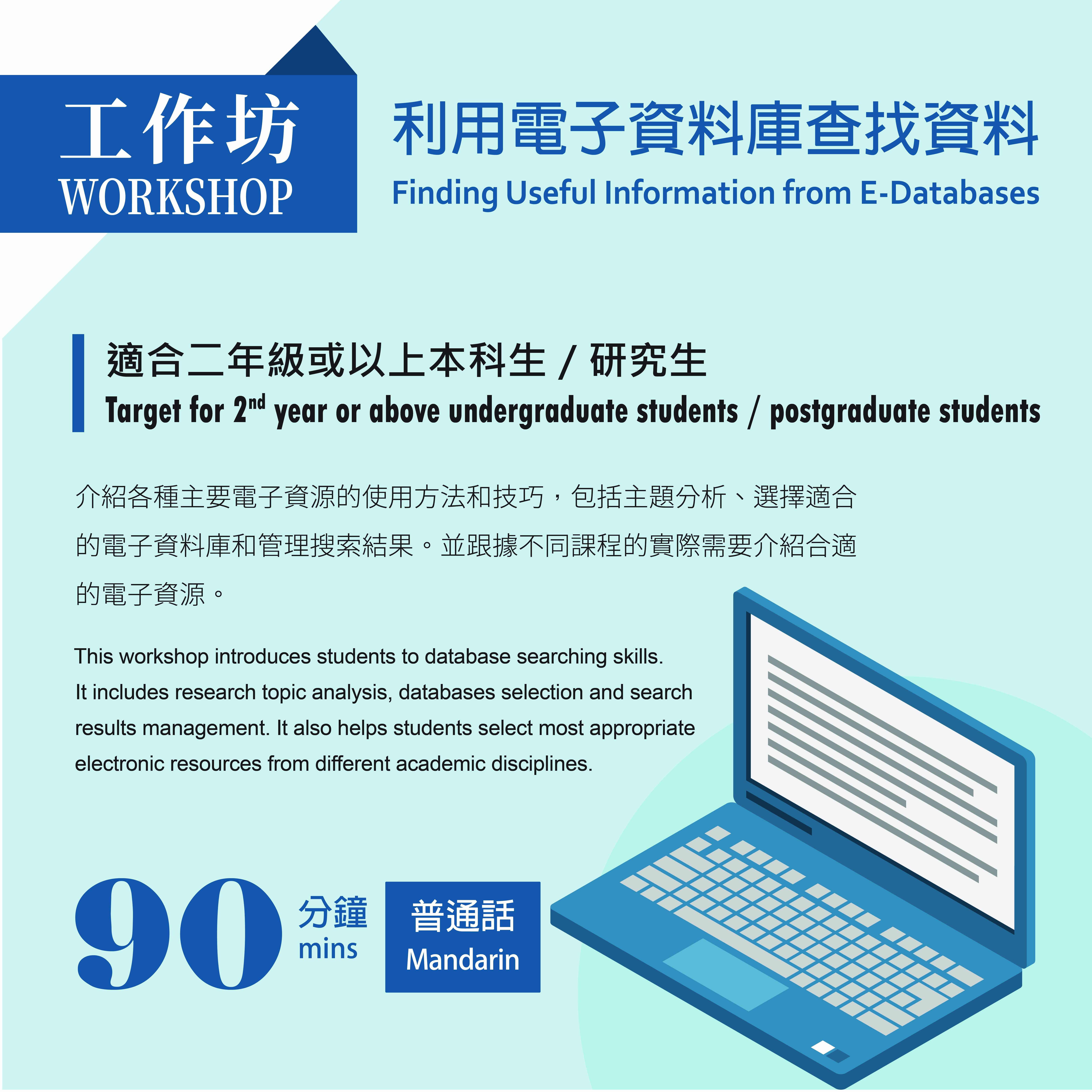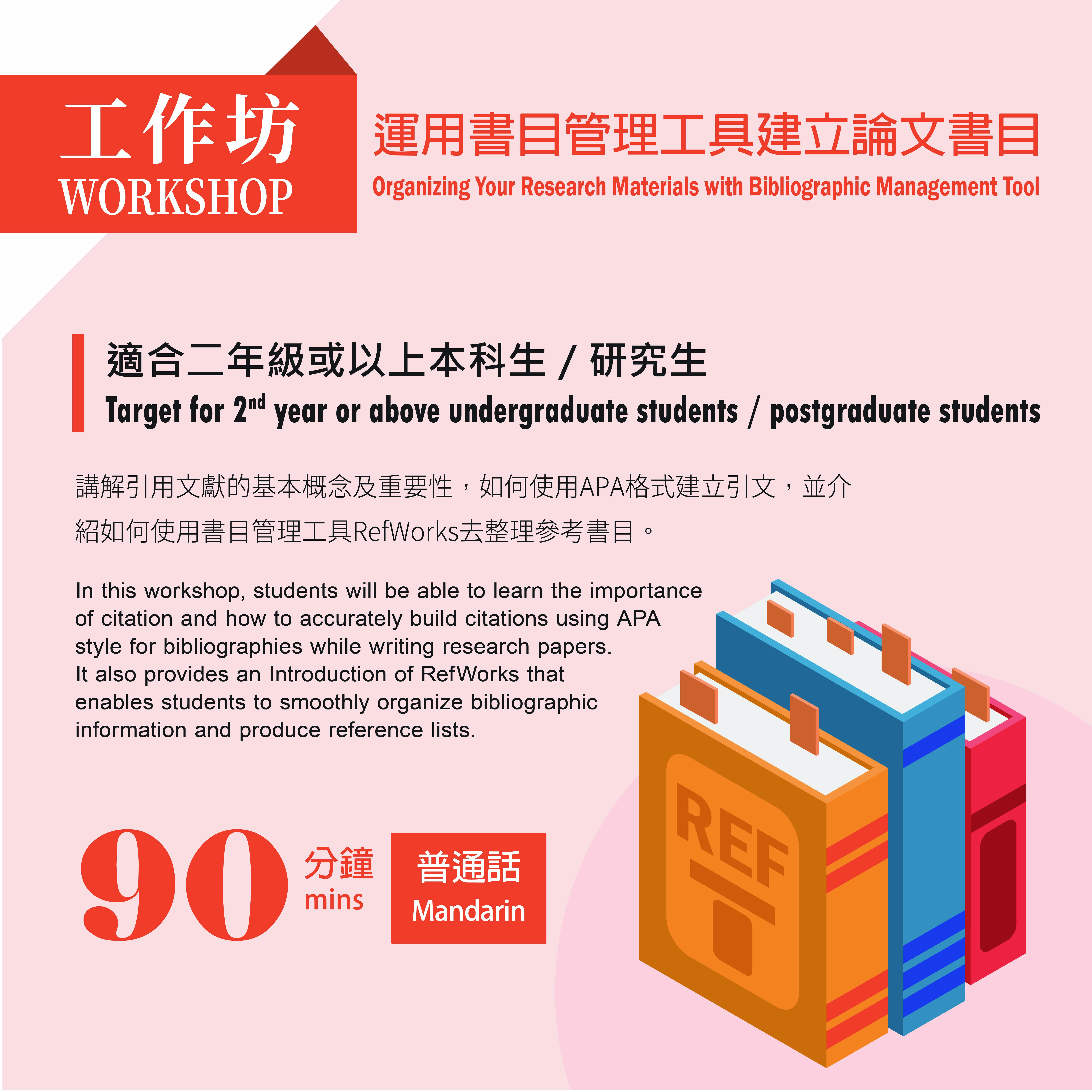 圖書館每年均舉辦各種工作坊/研討會/課程相關指導/新生導覽等活動,旨在讓讀者能更有效地使用圖書館的各種資源和服務、提昇研究技巧和資訊素養技能。請選擇適合你的工作坊。預約工作坊或安排舉辦其他類型工作坊講座,歡迎與我們聯繫。
